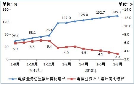 2017年8月-2018年8月電信業務總量及收入累計增速完成情況