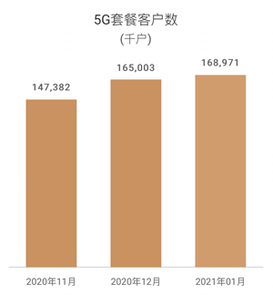 飛象網訊(致新/文)2月22日消息,中國移動今日公布2021年1月份運營數據,當月凈增5G套餐客戶數396.8萬戶。截至2021年1月末,5G套餐客戶數累計達1.68971億戶。