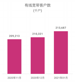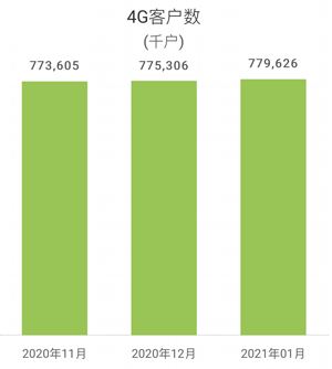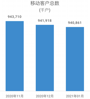 數據顯示,2021年1月份,中國移動用戶總數達到9.40861億戶,當月凈減客戶數105.7萬戶。中國移動4G客戶數達到7.79626億戶,當月凈增432萬戶。有線寬帶方面,中國移動有線寬帶客戶總數達到2.13687億戶,當月凈增客戶數336.6萬戶。