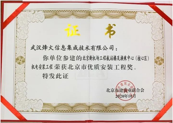 近日,由烽火旗下子公司武漢烽火信息集成技術有限公司參建的北京新機場(北京大興國際機場)工程航站樓及換乘中心(核心區)機電安裝工程榮獲“北京市優質安裝工程獎”,該獎項由北京市建筑業聯合會頒發。