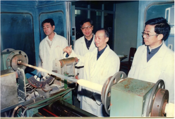 ↑ 1976年,趙梓森院士(右二)土法上馬拉出的第一根實用化光纖在中國信科誕生