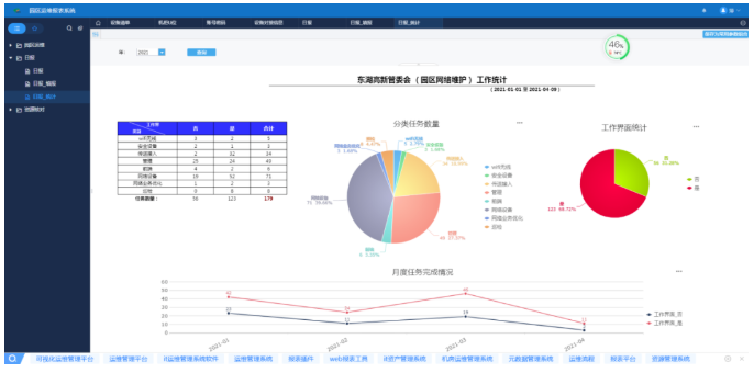 針對運維初期存在的數據信息更新不及時、版本繁多、數據遺漏等問題,團隊自研開發并試運行了一套運維報表管理系統,可對整個機房的設備狀態、類型、廠家等信息進行統計、查詢。每日記錄網絡工作日志后,系統可根據日志數據自動按周、月、季度生成數據圖。在使用運維系統進行統一錄入管理后,整個數據臺賬能精準查詢,還能根據關注項目自動輸出圖表,大大緩解了日常記錄、分析類繁瑣工作的壓力,更好地對園區網絡進行運維管理。