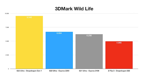 甚至Exynos 2200還沒有實(shí)現(xiàn)所謂的“物以稀為貴”,Exynos 2200的實(shí)際表現(xiàn),似乎也受到了三星4nm工藝的拖累,在智能手機(jī)中的能效表現(xiàn)處在同級別墊底水平。根據(jù) Erdi Özüağ分享的實(shí)測數(shù)據(jù)顯示,盡管以AMD架構(gòu)的GPU作為產(chǎn)品亮點(diǎn),然而Exynos 2200的GPU效能比新驍龍8落后約30%,3DMark Wild Life跑分落后近3000分。GFXBench表現(xiàn)也明顯落后,新驍龍8拿到230分,Exynos 2200則176,這一成績甚至與上一代Exynos 2100成績完全一致。