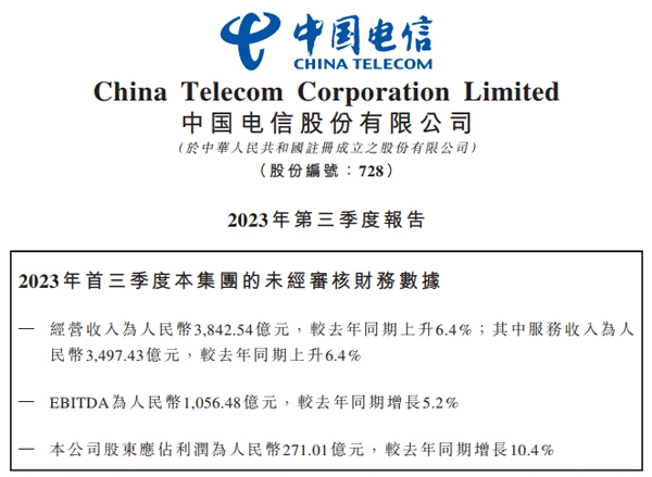 飛象網(wǎng)訊(致新/文)10月23日消息,中國(guó)電信近日公布2023年首三季度未經(jīng)審核財(cái)務(wù)數(shù)據(jù)。2023年前三季度,中國(guó)電信經(jīng)營(yíng)收入為3,842.54億元,較去年同期增長(zhǎng)6.4%,其中服務(wù)收入為3,497.43億元,較去年同期增長(zhǎng)6.4%。公司股東應(yīng)占利潤(rùn)為271.01億元,較去年同期增長(zhǎng)10.4%。每股基本凈利潤(rùn)為0.30元。