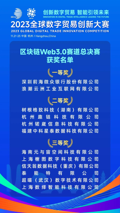 區(qū)塊鏈Web3.0賽道中,深圳前海微眾銀行股份有限公司、浪潮云洲工業(yè)互聯(lián)網(wǎng)有限公司斬獲一等獎(jiǎng),樹(shù)根格致科技(湖南)有限公司、杭州趣鏈科技有限公司、杭州锘崴信息科技有限公司、福建中科星泰數(shù)據(jù)科技有限公司斬獲二等獎(jiǎng)、海南元與宙空間科技有限公司、上海榭圖數(shù)字科技有限公司、信天翁數(shù)據(jù)科技(重慶)有限公司、泰能特有限公司、超喵(武漢)數(shù)字技術(shù)有限公司、上海數(shù)繹智能科技有限公司斬獲三等獎(jiǎng)。