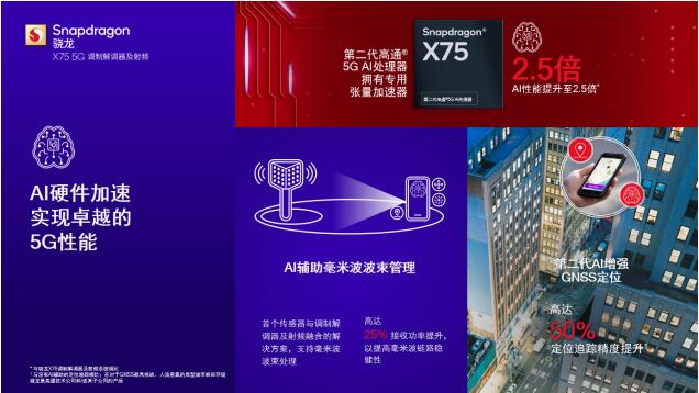剛才提到,AI實際上離我們的日常生活并不遙遠。實際上,高通已經把很多AI方面的技術應用到現有的產品當中。在今年2月,高通推出了全球首個5G Advanced調制解調器及射頻系統——驍龍X75。驍龍X75集成了高通第二代5G AI處理器,我們基于5G AI處理器也實現了一些典型應用,包括把AI應用于毫米波波束管理,能夠進行精準識別,找到最佳波束,實現波束的對準和跟蹤。在應用這項技術之后,可以把毫米波的接收功率提升高達25%。另外我們也把AI引擎應用到定位跟蹤方面,把所有的GNSS信息,包括從傳感器等位置獲得的信息進行融合,并且進行推演,使定位精度提升高達50%。