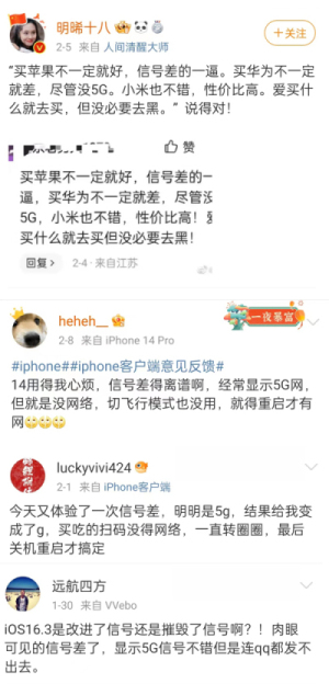 除了網絡覆蓋,對手機5G網絡體驗產生直接影響的還有5G基帶芯片。以蘋果iPhone為例,得益于蘋果自研的A芯片和iOS系統,iPhone長久以來都被奉為手機體驗的天花板,但要說iPhone信號差也是出了名的。蘋果的5G手機雖然搭載了蘋果自研的A處理器,但是蘋果沒有自研的5G集成芯片,只能選擇外掛的方式,但效果并不太好,尤其是iPhone13和iPhone14手機,經常被吐槽信號太差。