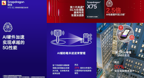 驍龍X75的AI能力也迎來了進一步升級,第二代高通5G AI處理器帶來全新算法,擁有首個采用專用硬件的張量加速器,能夠讓驍龍X75的AI性能提升至前代的2.5倍。同時引入了第二代高通5G AI套件,具備AI賦能的全新優化特性,實現更高的連接速度、移動性、鏈路穩健性和定位精度以及更廣的網絡覆蓋。