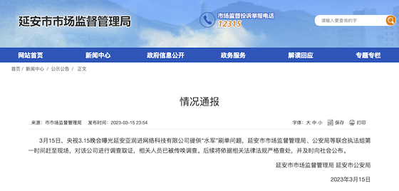 當晚,陜西延安市市場監(jiān)管局和延安市公安局聯(lián)合發(fā)布通報,3月15日,央視3.15晚會曝光延安亞潤進網(wǎng)絡(luò)科技有限公司提供“水軍”刷單問題,延安市市場監(jiān)督管理局、公安局等聯(lián)合執(zhí)法組第一時間趕至現(xiàn)場,對該公司進行調(diào)查取證,相關(guān)人員已被傳喚調(diào)查。后續(xù)將依據(jù)相關(guān)法律法規(guī)嚴格查處,并及時向社會公布。