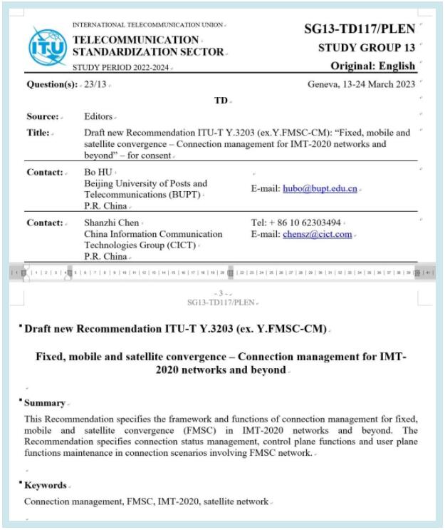 2023年3月,在剛剛結束的國際電信聯盟(ITU-T)SG13全體會議上,中國信科牽頭和主導制定的2項星地融合國際標準:《Y.3202,Fixed, mobile and satellite convergence: Mobility management for IMT-2020 networks and beyond》(固定、移動和衛星融合:面向IMT-2020及其演進網絡的移動性管理)、《Y.3203,Fixed, mobile and satellite convergence: Connection management for IMT-2020 networks and beyond》(固定、移動和衛星融合:面向IMT-2020及其演進網絡的連接管理)獲批結項,實現了星地融合通信關鍵技術在標準化方面的突破,為星地融合通信的技術研究和標準體系構建奠定了堅實基礎,標志著中國信科在星地融合“5G兼容、6G融合”取得的又一重大成果。