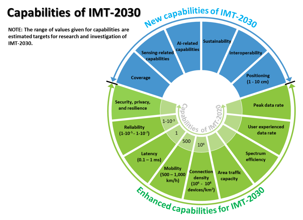建議書(shū)定義了15個(gè)能力指標(biāo),即連接數(shù)密度、移動(dòng)性、時(shí)延、可靠性、定位精度、峰值速率、用戶(hù)體驗(yàn)速率、頻譜效率、區(qū)域流量密度、感知相關(guān)指標(biāo)、AI相關(guān)指標(biāo)、安全隱私韌性性能指標(biāo)、可持續(xù)性性能指標(biāo)、覆蓋、互操作。