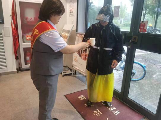 7月30日,北京電信營業廳愛心專員邀請環衛工人進廳避雨,并遞上熱水。