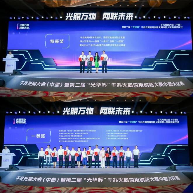 會上,由中國電信武漢分公司聯合烽火通信申報的《烽火雙千兆——自研“一條纖”創新“一座園”》、中國移動宜昌分公司聯合烽火通信申報的《基于POL全光網的提標擴能數字醫院建設項目》分別榮獲特等獎和一等獎。