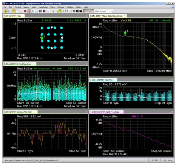 讓我們以 4096 QAM 調(diào)制為例。802.11be 的 QAM 調(diào)制比上一代 802.11ax 的誤差矢量幅度(EVM)要求更加嚴(yán)格,減少了 3 dB,從 -35 dB 降低為 -38 dB。在具有挑戰(zhàn)性的 EVM 要求下,噪聲、功率放大器的非線性、相位噪聲等誤差因素將受到更嚴(yán)格的審視。為了應(yīng)對(duì)這些變化,就需要用高性能的信號(hào)分析測(cè)試軟件和設(shè)備來滿足更低 的EVM分析。