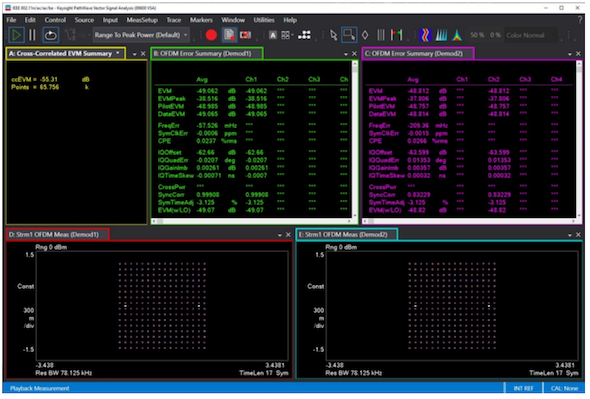 圖 2 是使用 ccEVM 軟件的一個(gè)示例。在本例中,工程師使用一個(gè)信號(hào)發(fā)生器、兩個(gè)接收機(jī)及 ccEVM,802.11be WLAN 信號(hào)的 EVM 值降低了 6 dB。