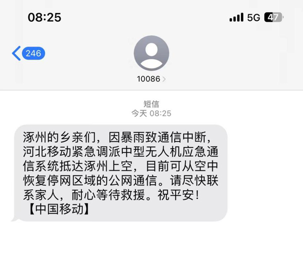 飛象網訊 “【中國移動】——涿州的鄉親們,因暴雨致通信中斷,中國移動緊急調派中型無人機應急通信系統抵達涿州上空,目前可從空中恢復停網區域的公網通信。請盡快聯系家人,耐心等待救援。祝平安!”8月3日早晨,保定涿州災區的群眾收到一條來自空中的問候短信。