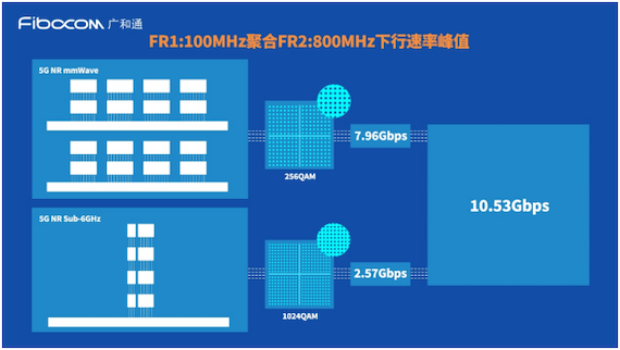驍龍X75是高通推出的首個5G Advanced-ready調制解調器及射頻系統,支持全球首個面向毫米波頻段的十載波聚合、全球首個Sub-6GHz頻段下行五載波聚合和FDD上行MIMO,從而支持卓越的頻譜聚合和容量。基于驍龍X75,廣和通已推出支持Sub-6GHz和mmWave頻段的模組FM190W-GL,率先布局5G-A。下行方面,廣和通FM190W-GL在毫米波頻段下支持8CA、800MHz頻寬、256QAM,聚合Sub-6GHz下2CA、100MHz頻寬、1024QAM,峰值可達10.53Gbps。上行方面,在毫米波頻段下支持400MHz頻寬、4CA、256QAM,聚合Sub-6GHz下100MHz頻寬、256QAM,峰值可達3.38Gbps,充分具備5G-A“萬兆下行、千兆上行”的速率要求。