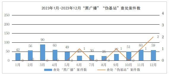 圖 2023年1月-2023年12月“黑廣播”“偽基站”查處案件數(shù)