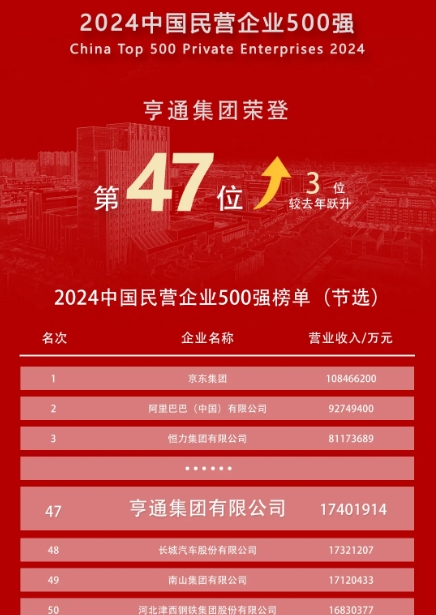 10月12日,中華全國(guó)工商業(yè)聯(lián)合會(huì)、甘肅省人民政府在蘭州舉行2024中國(guó)民營(yíng)企業(yè)500強(qiáng)發(fā)布會(huì)。全國(guó)政協(xié)副主席、全國(guó)工商聯(lián)主席高云龍,甘肅省委書(shū)記、省人大常委會(huì)主任胡昌升等領(lǐng)導(dǎo)出席。大會(huì)發(fā)布了2024中國(guó)民營(yíng)企業(yè)500強(qiáng)榜單并現(xiàn)場(chǎng)為企業(yè)代表頒發(fā)證書(shū)。亨通集團(tuán)排名繼續(xù)攀高,位列“2024中國(guó)民營(yíng)企業(yè)500強(qiáng)”第47位。