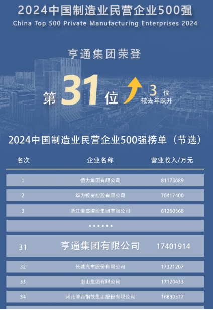 在同期發(fā)布的“2024中國(guó)制造業(yè)民營(yíng)企業(yè)500強(qiáng)”榜單中,亨通位列第31位,實(shí)現(xiàn)連年躍升。