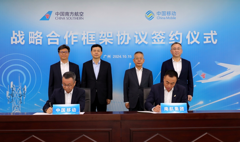 10月15日,中國移動與南航集團在廣州舉行戰略合作框架協議簽約儀式。中國移動董事長楊杰、總經理何飚,南航集團董事長馬須倫、總經理韓文勝出席簽約儀式,中國移動副總經理張冬、南航集團副總經理曲光吉代表雙方簽約。