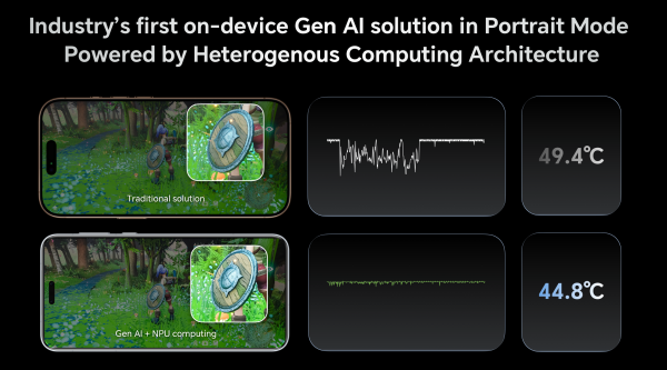 在性能提升方面,榮耀與高通致力于以端側AI技術賦能硬件,全面釋放SoC與影像性能表現,擊破硬件性能上限的天花板。在游戲性能領域,由于手機尺寸和電池壽命的限制,手機的“畫面質量-幀率-溫度”往往相互制約,成為手機游戲中常見的“三難困境”。在異源計算架構加持下,榮耀帶來了業界首創的由NPU驅動的AI實時渲染技術,實現了更為上乘的畫面質量、更高更穩定的幀率表現以及更加出色的溫控表現,系統性解決了三難困境。