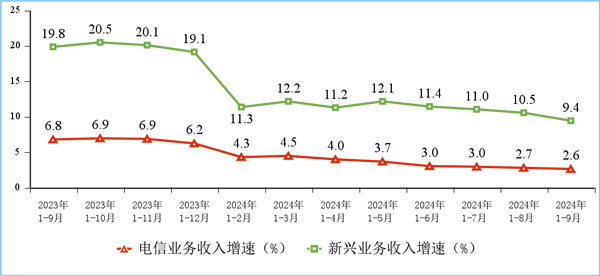 新興業務收入較快增長。三家基礎電信企業積極發展IPTV、互聯網數據中心、大數據、云計算、物聯網等新興業務,前三季度共完成業務收入3252億元,同比增長9.4%,占電信業務收入的24.7%,拉動電信業務收入增長2.2個百分點。其中云計算和大數據收入分別同比增長9.4%和61.8%,物聯網業務收入同比增長13%。