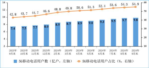 飛象網訊(致新/文)10月24日消息,根據工信部近日公布的《2024年前三季度通信業經濟運行情況》顯示,截至9月末,三家基礎電信企業及中國廣電的移動電話用戶總數達17.86億戶,比上年末凈增4206萬戶。其中,5G移動電話用戶達9.81億戶,比上年末凈增1.59億戶,占移動電話用戶的54.9%,占比較上年末提高8.3個百分點。