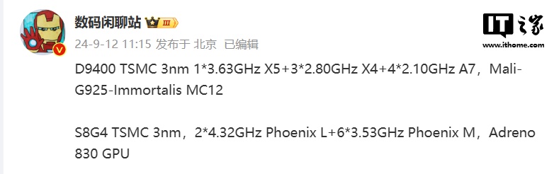 其中,代號 D9400 的芯片為天璣 9400,代號 SM8750 芯片預計命名驍龍 8 Gen 4 或驍龍 8 Elite。該博主本月中旬曬出了兩款處理器的具體參數信息,IT之家為大家匯總對比如下: