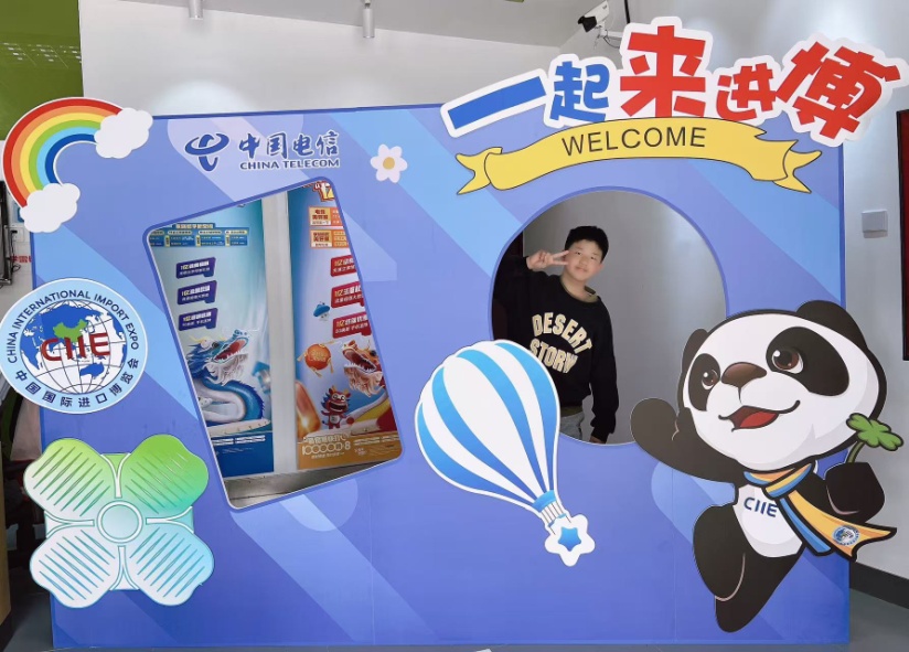 在青浦振涇路營業廳,上海電信還精心設置了“一起來進博”主題展覽,以獨特的創意與豐富的展示內容,成為熱門打卡地。周末,經常有家長帶著孩子特地先來營業廳拍照打卡后再前往展會現場。