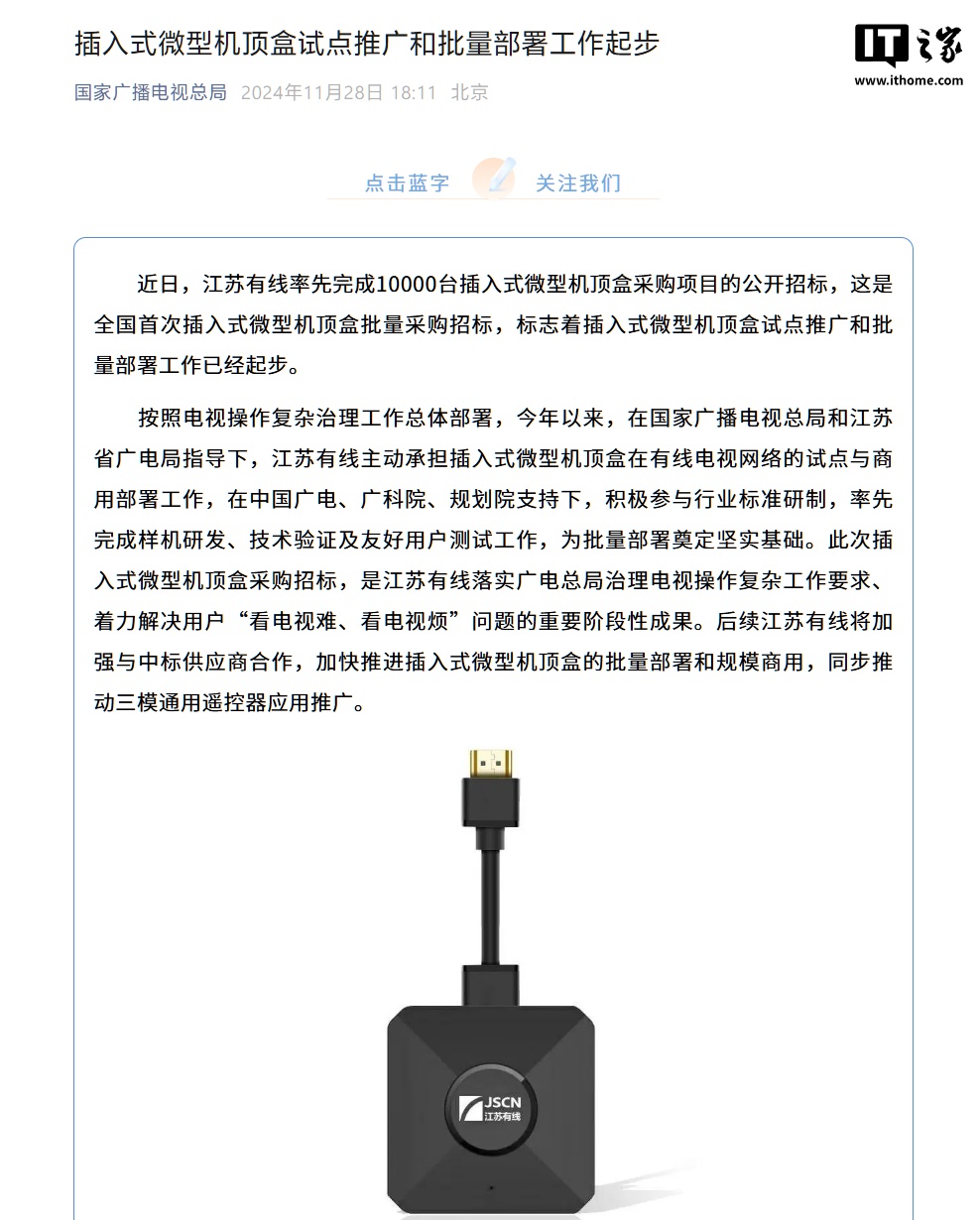 11 月 28 日消息,國家廣播電視總局官微今晚發布公告稱,江蘇有線率先完成 10000 臺插入式微型機頂盒采購項目的公開招標,這是全國首次插入式微型機頂盒批量采購招標,標志著插入式微型機頂盒試點推廣和批量部署工作已經起步。