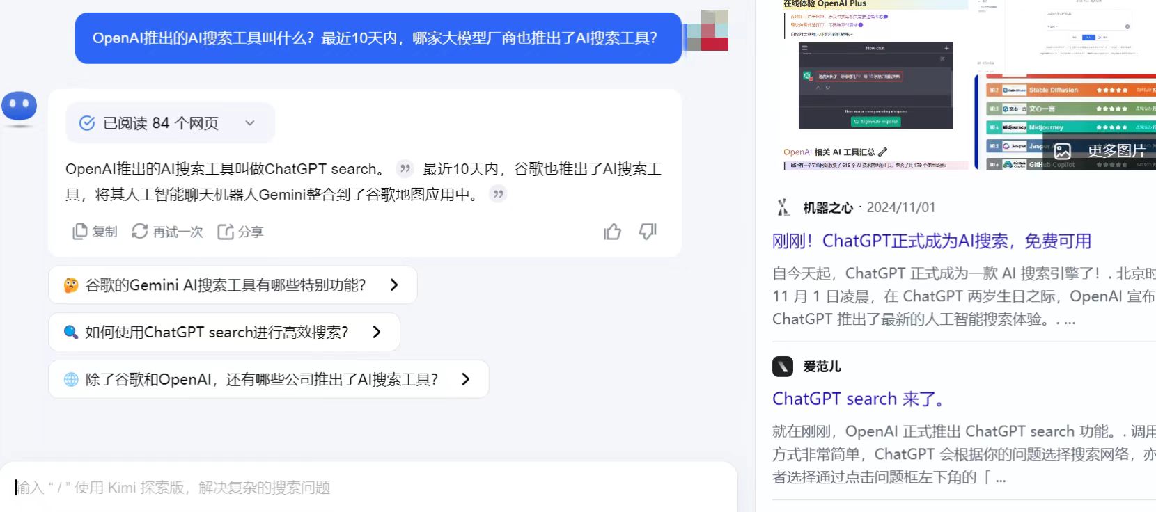 記者選擇了聯網搜索選項并嘗試向Kimi提問“OpenAI推出的AI搜索工具是什么,最近10天內哪家大模型廠商也推出了AI搜索工具?”Kimi很快給出了“OpenAI推出的AI搜索工具叫ChatGPT search,最近10天內谷歌也推出了AI搜索工具”的正確答案。OpenAI的介紹上看,ChatGPT search的頁面與Kimi相似,鏈接都在右邊的側邊欄中。