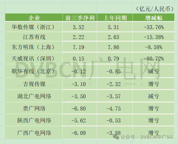 前三季度凈利(選取的均是歸母凈利)表現中,共有6家企業為虧損,其中的北京歌華有線、湖北廣電網絡兩家同比實現了一定幅度的減虧,但湖北廣電網絡虧損金額仍較高。4家企業同比增虧,虧損數字均較高,貴廣網絡前三季度已虧損6.80億元,數值最大;陜西廣電網絡去年前三季虧損0.53億元,今年已虧損5.62億元。
