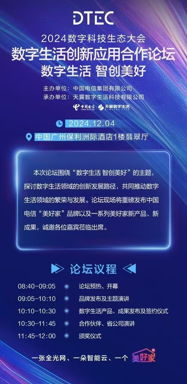 大會期間,以“數字生活 智創美好”為主題的數字生活創新應用合作論壇將于12月4日上午舉辦,該論壇旨在探討數字生活領域的創新發展路徑,共同推動數字生活領域的繁榮與發展。據悉,論壇現場將重磅發布中國電信“美好家”品牌以及一系列美好家新產品、新成果,讓人期待值拉滿!