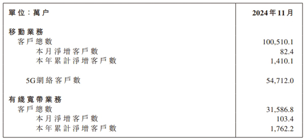數據顯示,2024年11月份,中國移動用戶總數達到10.05101億戶,當月凈增客戶數82.4萬戶。有線寬帶方面,中國移動有線寬帶客戶總數達到3.15868億戶,當月凈增客戶數103.4萬戶。