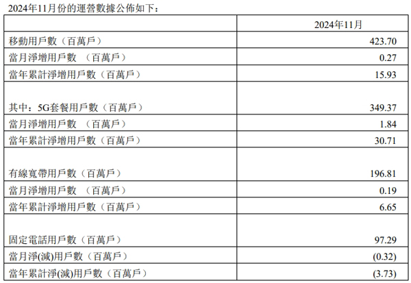 飛象網訊(致新/文)12月20日消息,中國電信今日公布2024年11月份運營數據。當月,中國電信移動用戶數凈增27萬戶,移動用戶數累計4.237億戶;當月5G套餐用戶凈增184萬戶,5G套餐用戶累計3.4937億戶。