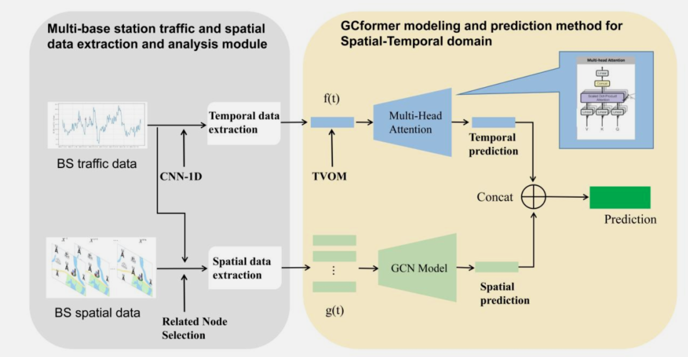 圖2. GCformer系統模型,包括通過1D-CNN和TVOM模塊改進的Transformer類模型和通過基站節點選擇并基于GCN模型的空間信息提取部分