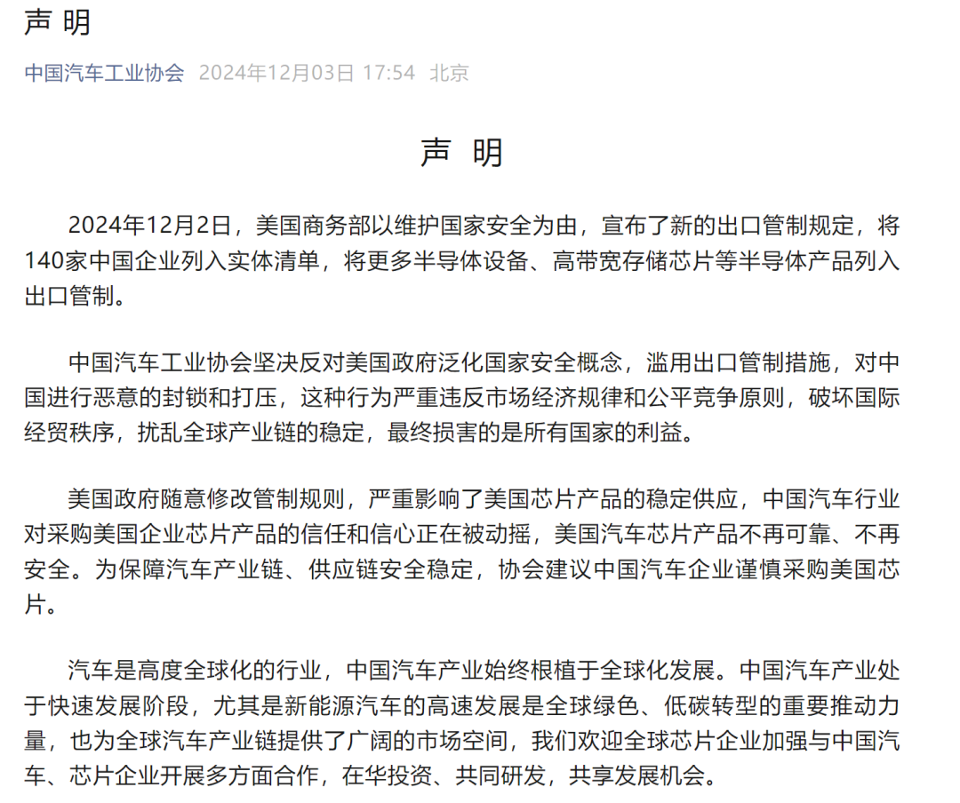 12月3日,中國汽車工業協會發布聲明稱,2024年12月2日,美國商務部以維護國家安全為由,宣布了新的出口管制規定,將140家中國企業列入實體清單,將更多半導體設備、高帶寬存儲芯片等半導體產品列入出口管制。