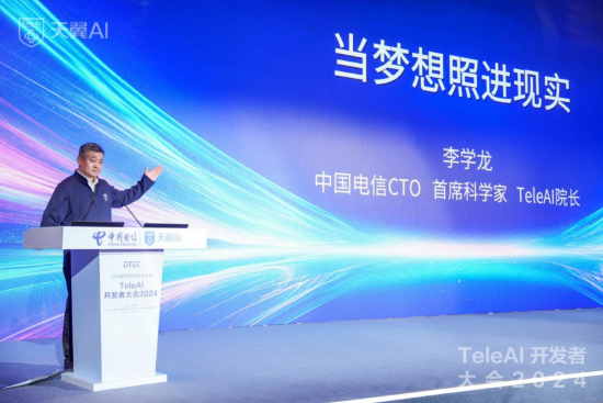 李學龍以“當夢想照進現實”為題進行分享,并發布星海AI中臺、天翼AI開放平臺、星辰智能體平臺等開放平臺,助力開發者大幅降低開發門檻,構建低成本、高效率的創新開發生態。同時,介紹了 TeleAI 在大模型全模態、全尺寸、全國產化體系構建的最新進展,及讓智能可以像水一樣流動到任何地方的智傳網技術前瞻布局。