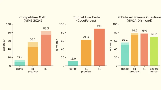 在國際數學奧林匹克預選賽題目(AIME 2024)中,o1拿到了83%的正確率,遠超GPT-4o的13%,比起o1 preview的56.7%也提升了將近一半。而在編程能力測試方面,o1從GPT-4o的11%躍升到89%,同樣也比o1 preview提升一半。