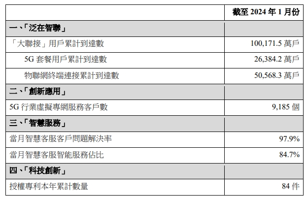 數據顯示,截至2024年1月份,中國聯通“大聯接”用戶累計達10.01715億戶,物聯網終端連接累計達5.05683億戶,5G行業虛擬專網服務客戶數達9185個,當月智慧客服服務問題解決率達97.9%,當月智慧客服智能服務占比達84.7%,授權專利本年累計數量達84件。