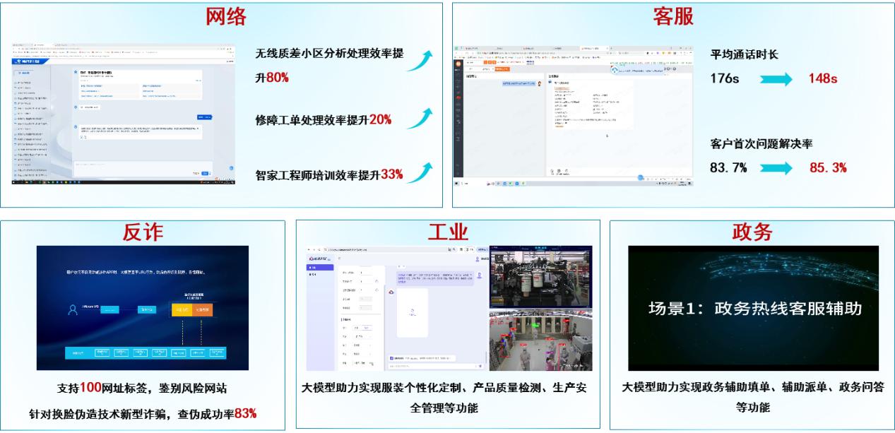 網絡領域,元景助力無線網絡質量分析效率提升80%,修障工單處理效率提升20%,智家工程師培訓效率提升33%。客服領域,元景助力平均通話時長壓降28秒,客戶首次問題解決率提升1.6pp。反詐領域,元景實現100類風險網站標簽鑒別,換臉識別成功率達到83%。工業領域,元景助力服裝個性化定制、產品質量檢測、生產安全管理等功能。政務領域,元景助力實現輔助填單、輔助派單、政務問答等功能。
