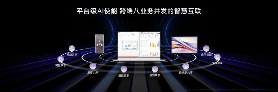 榮耀打造的平臺級AI可以賦能不同的設備,包括手機、平板、筆記本、可穿戴設備等跨設備跨操作系統的平臺級AI能力,使得安卓、Windows、IoT等開放的操作系統變成了整體生態,趙明稱之為“胖終端”,可以理解為多終端設備在同一榮耀賬號下融合成一個完整的設備。例如,榮耀MagicBook Pro 16通過MagicRing,輕松實現跨端八業務并發的跨設備智慧互聯,輕松實現手機聊天窗口拖拽到PC、手機圖片拖拽到PC文檔、手機網絡共享給PC等功能。