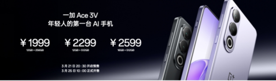 一加 Ace 3V 于 3 月 21 日 20:30 開啟預(yù)售, 3 月 25 日 10:00 正式開售,售價(jià) 1999 元起。發(fā)布會(huì)上,全新 TWS 耳機(jī)一加 Buds V 同步亮相,售價(jià) 179 元。