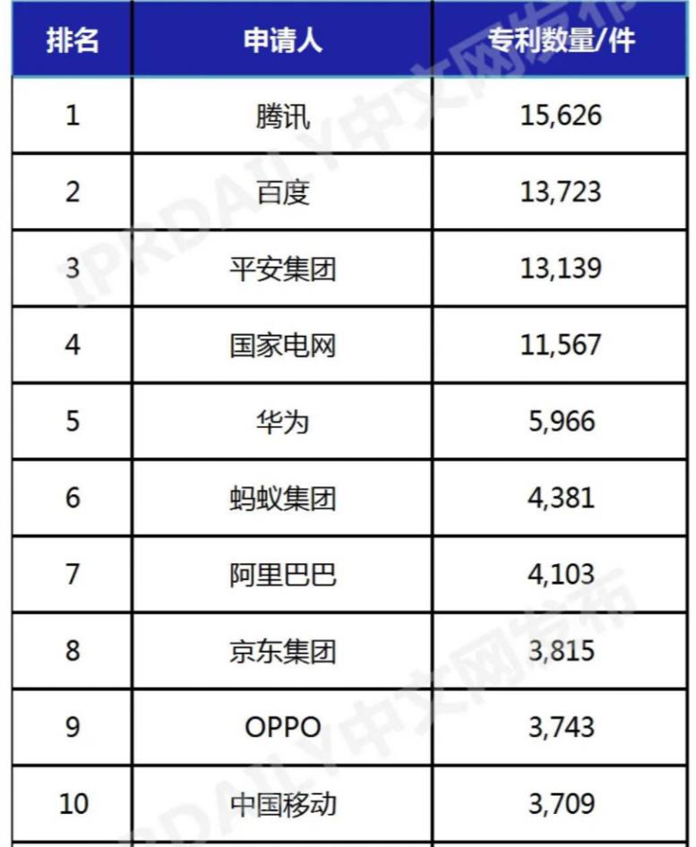 數據顯示,上榜企業主要為互聯網廠商、金融機構以及通信手機企業,其中騰訊以15626件專利數排名第一,百度、平安集團緊隨其后。華為、OPPO則進入前十。