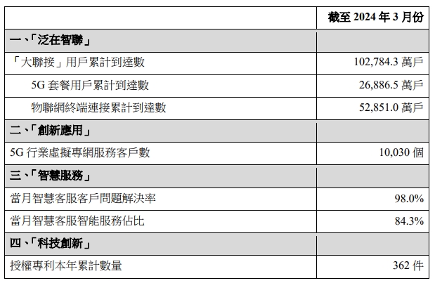 數據顯示,截至2024年3月份,中國聯通“大聯接”用戶累計達10.27843億戶,物聯網終端連接累計達5.2851億戶,5G行業虛擬專網服務客戶數達10030個,當月智慧客服服務問題解決率達98%,當月智慧客服智能服務占比達84.3%,授權專利本年累計數量達362件。