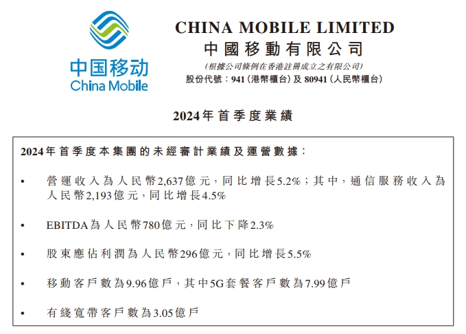 個(gè)人市場(chǎng)方面,截至2024年3月31日,中國(guó)移動(dòng)集團(tuán)移動(dòng)客戶總數(shù)9.96億戶,其中5G套餐客戶數(shù)達(dá)到7.99億戶,5G網(wǎng)絡(luò)客戶數(shù)達(dá)到4.88億戶;首季度,手機(jī)上網(wǎng)流量同比增長(zhǎng)3.3%,手機(jī)上網(wǎng)DOU達(dá)到14.9GB;移動(dòng)ARPU為47.9元。