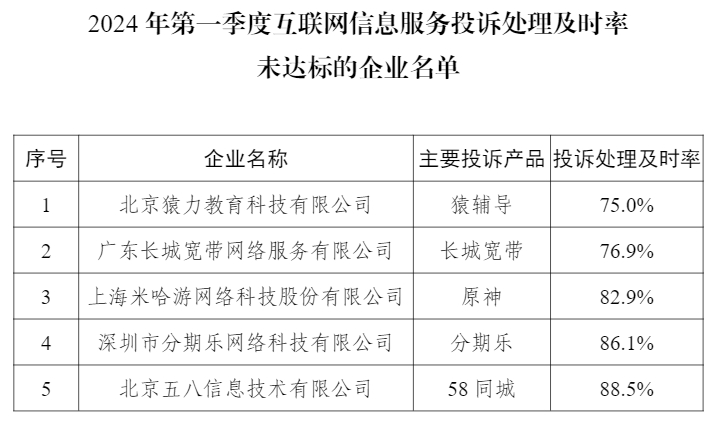 在互聯網信息服務投訴方面,2024年第一季度,互聯網信息服務投訴平臺收到的互聯網用戶投訴中,服務功能類投訴占比43.4%,客服渠道類投訴占比27.7%,個人信息保護類投訴占比15.1%,其他類投訴占比13.8%。在接入平臺的175家互聯網企業中,猿輔導等5家企業投訴處理及時率較低,工信部已督促相關企業妥善處理用戶反映的問題。