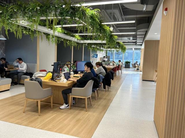 模速空間寬敞的公共區域,許多人辦公、交流、開會。