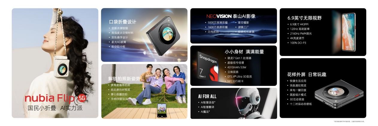 除了旗艦機外,努比亞還帶來了旗下第一款小折疊——努比亞Flip,專為年輕人量身打造。新年輕主義設計彰顯純粹、堅定、個性。外屏一屏多用,無需開屏即可拍照、聽歌、查看天氣等,各種通知消息及來電也能通過外屏直接顯示和操作;獨特帳篷模式,立著展開時外屏亦可使用。此外,多款生動乖巧的3D互動小寵物,音樂播放時黑膠唱片UI設計、十二時辰動態壁紙,都為這塊靈動外屏增色不少。內屏展開為6.9英寸的超高清柔性大屏,PPI高達443,支持120Hz高刷新率,2160Hz PWM調光。